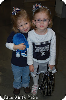 This afternoon we took the girls to Xavier’s Musketeer Madness.  They had so much fun.  Stella finally got her XU pom-poms (they were sold out most of last season) and Charlotte fell in love with the Blue Blob mascot and talked daddy into getting her the plush toy.  The Blue Blob is actually on her t-shirt, but you can’t see it because she’s hugging the plush toy for every photo!  You can see photos of the actual Blue Blob by clicking HERE.