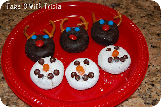 First up, Christmas morning breakfast for the kids. I found both of the donut ideas on Pinterest. They suggested using icing and other major-work decorations. However, I had extra brown and blue mini M&Ms and orange Mike and Ike’s on hand from our ice cream cone turned into Christmas tree decorating plus red M&Ms from the Crispix mix and we always have pretzels in the house, so voila!