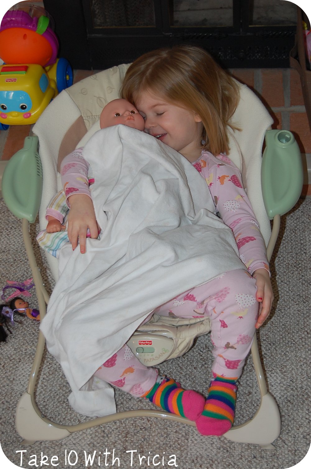 This crazy girl has been snuggling with her babies in it.