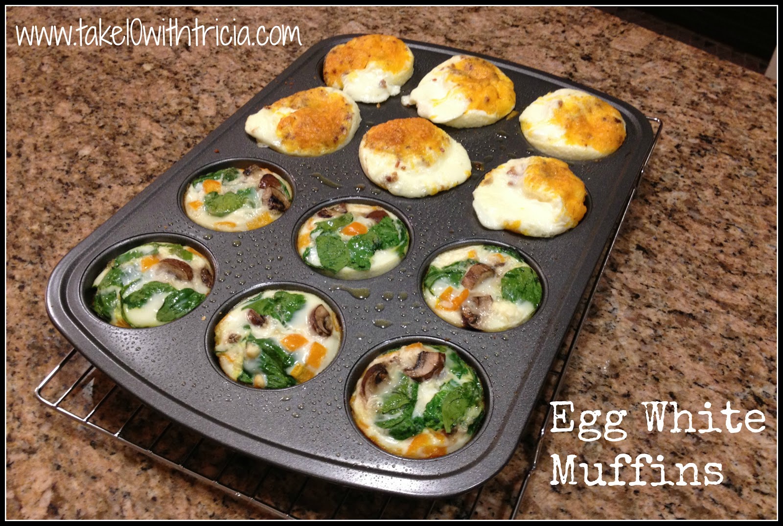 All you need is a muffin pan, eggs or egg whites, and “fillings”. I went ahead and used a container of All Whites I picked up from Kroger. I split the muffin tin in half – half for me and half for Andy. His half has bacon bits and cheddar cheese. My half has raw peppers, spinach, mushrooms and a bit of feta.