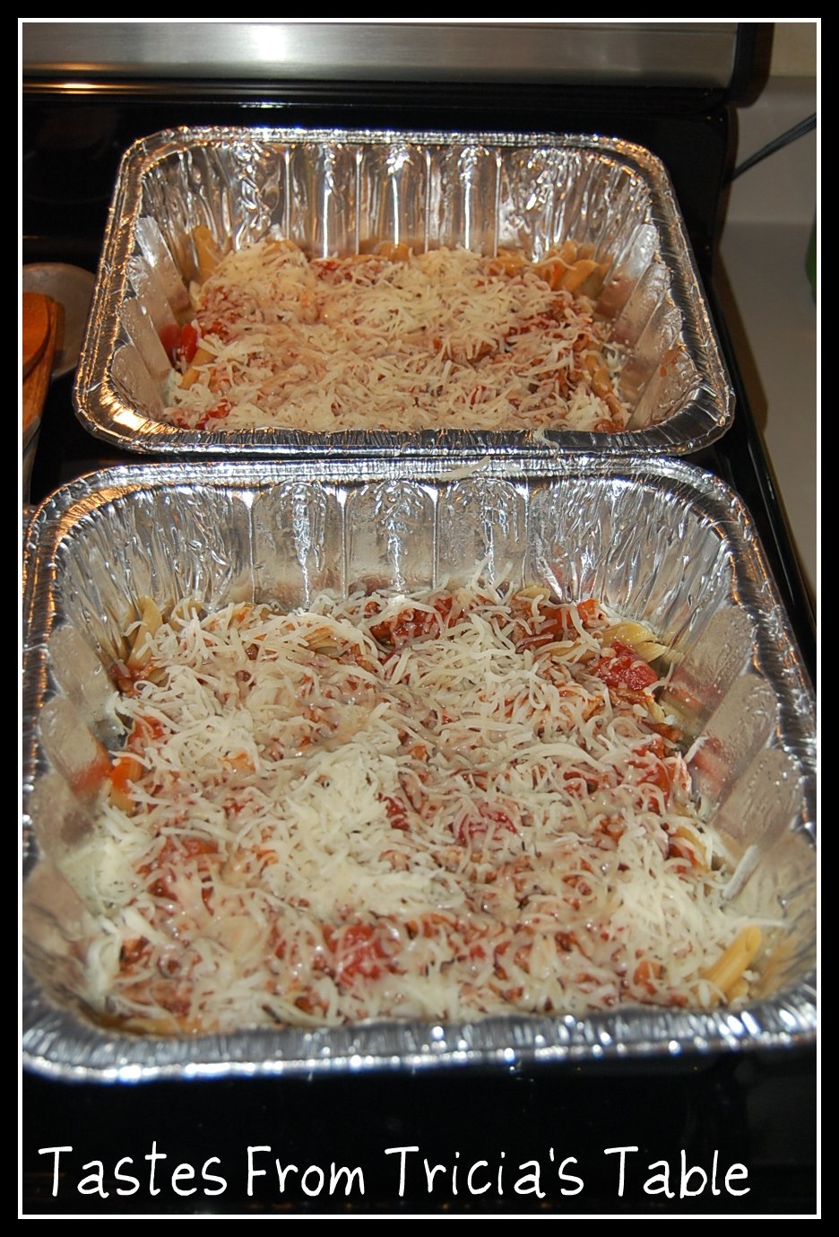 Layer half pasta, half sauce, half cheese in 13 x 9” baking dish; repeat.